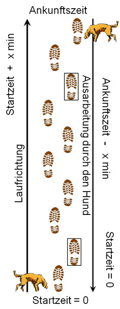 Grundsätzlich erfolgt die Ausbildung von Mantrailern dergestalt, dass diese einem Geruch folgen sollen, der von alt nach frisch verläuft.Damit wird dem natürlichen Jagdverhalten des Hundes entsprochen. Eine mögliche phylogenetische Erklärung dafür kann darin bestehen, dass sich der Hund vor Domestizierung seine Nahrung suchen musste. Wenn er den Geruch eines für ihn relevanten Beutetiers wahrgenommen hatte, war es von Bedeutung, in welcher Richtung dieses Tier gelaufen ist, ob ggf. die Möglichkeit besteht, es zu jagen und einzuholen. Zu diesem Zweck sind sowohl Zeitinformation und die daraus resultierende Richtungsinformation von Belang. Steen und Wilsson (Steen and Wilsson, 1990) und danach auch Wells und Hepper (Wells and Hepper, 2003) hatten nachgewiesen, dass Hunde in der Lage sind, die Richtung einer Spur zu bestimmen. Darüber hinaus hatten Hepper und Wells (Hepper, 2005) eben-falls herausgefunden, dass dafür (nur) fünf Schritte erforderlich sind. Sie errechneten eine Zeitdifferenz von etwa ein bis zwei Sekunden, innerhalb derer eine für den Hund erkennbare Veränderung eingetreten sein muss, die er zur Richtungsbestimmungen nutzen kann. Weitere Arbeiten, die insbesondere die in Rede stehende Fallgestaltung der Richtungsbestimmung von alt nach frisch untersucht haben, sind hier nicht bekannt. Es steht also außer Frage, dass Hunde in der Lage sind, die Zeitinformation einer Spur und damit deren Richtungsverlauf zu erkennen.